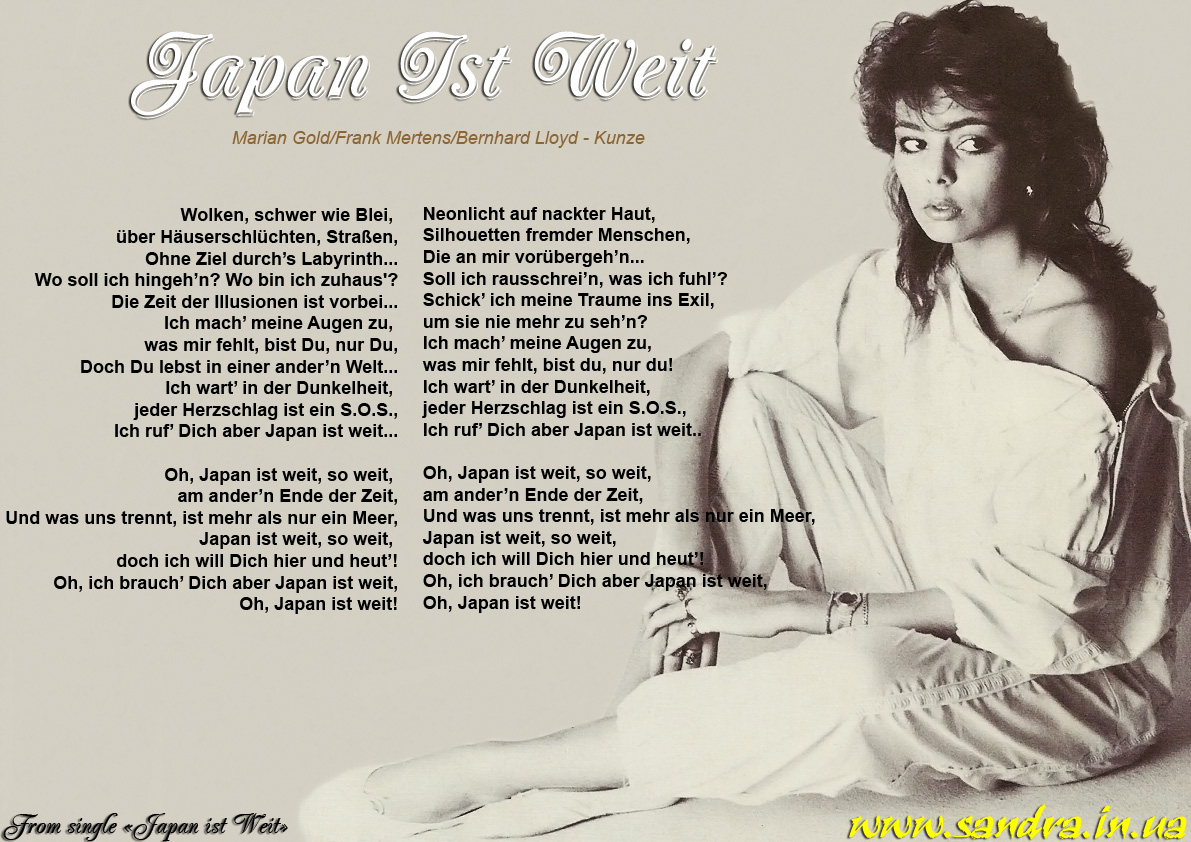 Wolken, schwer wie Blei, über Häuserschlüchten, Straßen, Ohne Ziel durch’s Labyrinth... Wo soll ich hingeh’n? Wo bin ich zuhaus'? Die Zeit der Illusionen ist vorbei... Ich mach’ meine Augen zu, was mir fehlt, bist Du, nur Du, Doch Du lebst in einer ander’n Welt... Ich wart’ in der Dunkelheit, jeder Herzschlag ist ein S.O.S., Ich ruf’ Dich aber Japan ist weit... Oh, Japan ist weit, so weit, am ander’n Ende der Zeit, Und was uns trennt, ist mehr als nur ein Meer, Japan ist weit, so weit, doch ich will Dich hier und heut’! Oh, ich brauch’ Dich aber Japan ist weit, Oh, Japan ist weit! Neonlicht auf nackter Haut, Silhouetten fremder Menschen, Die an mir vorübergeh’n... Soll ich rausschrei’n, was ich fuhl’? Schick’ ich meine Traume ins Exil, um sie nie mehr zu seh’n? Ich mach’ meine Augen zu, was mir fehlt, bist du, nur du! Ich wart’ in der Dunkelheit, jeder Herzschlag ist ein S.O.S., Ich ruf’ Dich aber Japan ist weit.. Oh, Japan ist weit, so weit, am ander’n Ende der Zeit, Und was uns trennt, ist mehr als nur ein Meer, Japan ist weit, so weit, doch ich will Dich hier und heut’! Oh, ich brauch’ Dich aber Japan ist weit, Oh, Japan ist weit!